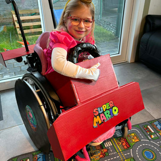 Al sinds haar verjaardag in juni 2024 was Félien helemaal fan van Mario Bros. En zoals elk meisje was haar favoriete personage Prinses Peach. Haar hele verjaardag stond in teken van Mario en de liefde bleef hangen tot op heden. Dus ik kon er niet aan onderuit om met carnaval in dit thema te gaan. Terug richting Pinterest keek ik voor inspiratie. Veel kon ik niet vinden en wat ik vond, was meestal nog een niveau’tje te hoog voor mij. Maar enkele zaken gaven me wel inspiratie. Ik ging het toch proberen iets in elkaar te fabriceren. Ik vroeg in de omgeving naar enkele kartonnen dozen en ik spaarde enkele lege keukenrollen voor de uitlaten. Het werd een heel werk van meten, uittekenen, afmeten en op hoop van zegen de juiste berekeningen maken. Het heeft even geduurd maar met de hulp van een vriendin lukte het wel om een leuke Kart met stuur en vuur te maken. Félien zelf heeft ook een beetje mogen helpen en ze heeft de Mario-hoofden op de wielen ingekleurd als ook het logo vooraan.