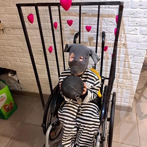 Om tijdig te kunnen het nodige gerief te verzamelen, begin ik in november al te polsen bij Félien wat ze graag zou willen zijn. En dan probeer ik ook in te schatten in hoeverre ze de keuze zal vasthouden tot februari. Uiteindelijk wilde ze graag een boefje zijn. Zelf had ik geen idee van waar haar interesse in boeven, maar ik kon er wel wat mee. Want in welke omgeving zit een boef meestal? Een gevangenis natuurlijk. Nu nog uitdokteren hoe ik dit kan waarmaken. En ik moet eerlijk toegeven, de uitvoering kon uiteindelijk wel beter. Ik had afmetingen genomen van de rolstoel en enkele houten latjes gaan halen in de doehetzelf-zaak. Deze eerst zwart geverfd en daarna met spijkers in een constructie geslagen tot een soort kooi. Om het toch een kleurrijker geheel te maken had ik ook enkele hartjes fel-roze geverfd en op de kooi vastgemaakt. Ik doopte haar dan ook om tot hartendiefje. Ook had ik er nog een voetboei met kogel bij gemaakt uit isomo. Het geheel zag er wel tof uit, maar stabiel was het helemaal niet. En met de nagels was het ook niet zo veilig toen de kooi uit elkaar viel. Maar toch een geslaagde editie weer want er kwamen weeral veel leuke reacties hierop.