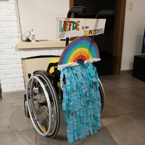 Toen ik haar naar school bracht in de versierde rolstoel, merkte ik op dat er enkele kindjes aan het staren waren. Maar ik had er niet zo hard bij stilgestaan. Félien was wel heel bij met haar rolstoel en dat was mijn bedoeling. Op het einde van de schooldag schoot er ook niet veel meer over van de waterval. De lijm was overal losgekomen en de meeste blauwe crepe-papiersnippers waren weggewaaid. Maar geen probleem. Het was een leuke dag en dat was het belangrijkste.